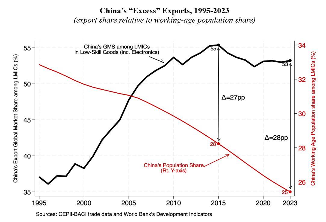 Even with such wage differentials, China’s export strength might be less troubling if it stemmed purely from productivity gains and automation. In that case, one would still have to question China’s hegemonic legitimacy, because true hegemons accommodate rather than crowd out others, but it would not necessarily be unfair. Mounting evidence suggests that this is not the case, though. Instead, China shows signs of significant policy distortions. Industrial subsidies, undervalued exchange rates, and persistent excess capacity are all tilting the playing field in its favour. China’s continued dominance reflects not just efficiency, but deliberate policy choices that prevent poorer countries from climbing the development ladder.