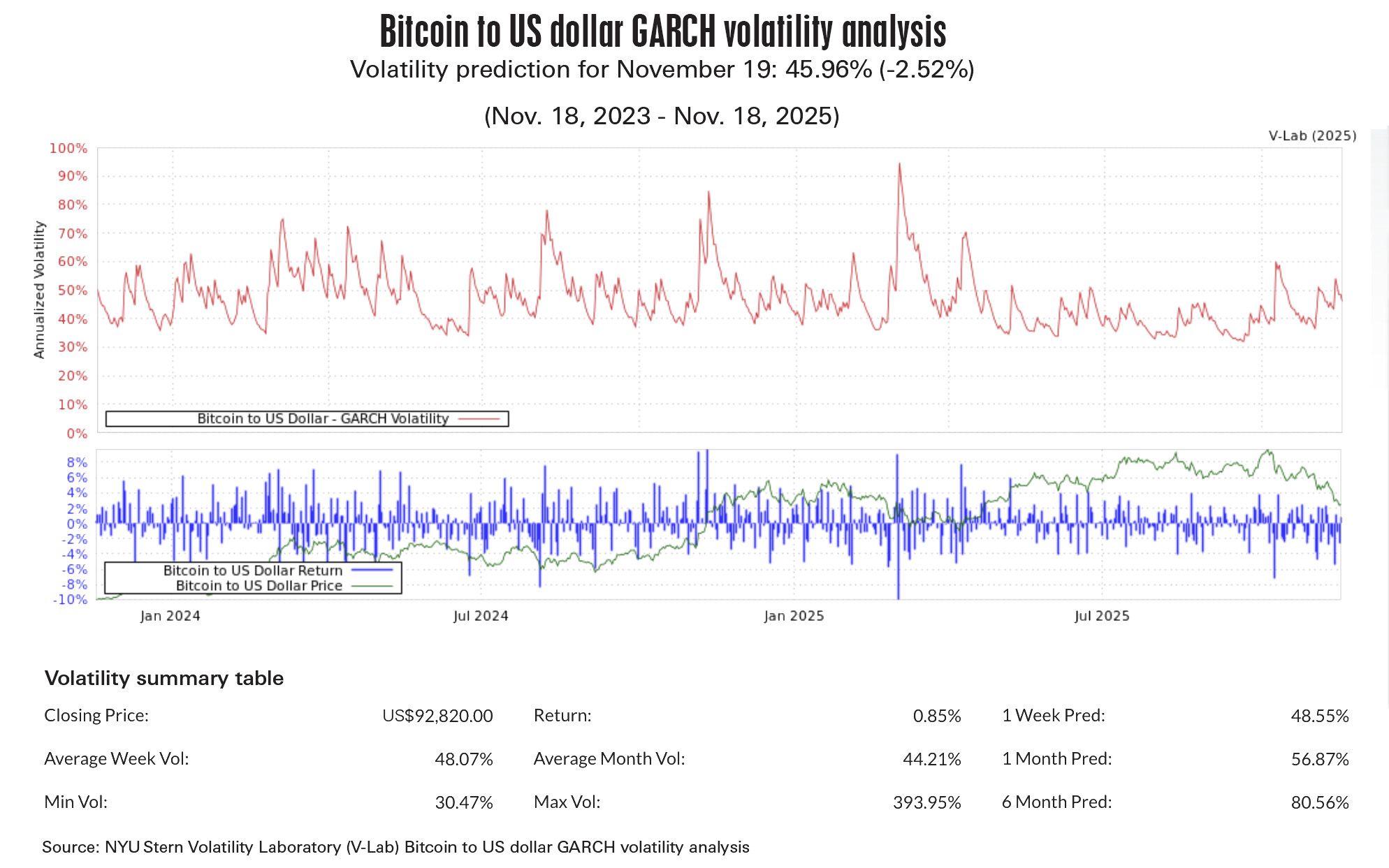 While forecasts ( or hypotheticals ) for Bitcoin point to price swings of 25% or more from its recent highs, the psychological and practical discomfort it engenders among conservative allocators is real. At present, Bitcoin exhibits two to three times more volatility than gold, and three to five times compared to global equities, according to the Bitcoin to US Dollar GARCH Volatility Analysis.